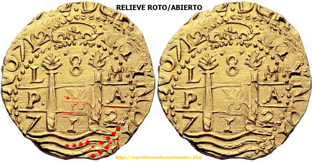 Hay otro detalle que nos indica la ceca: la forma de las olas. Solo hay que fijarse en el centro de las dos columnas. Si ese centro está hacia abajo (un matemático diría que hace un mínimo, como es el caso de esta moneda), entonces se trata de una moneda acuñada en Lima; si está hacia arriba (hace un máximo), entonces es Potosí. https://blognumismatico.com/2019/11/21/8-escudos-lima-1712/