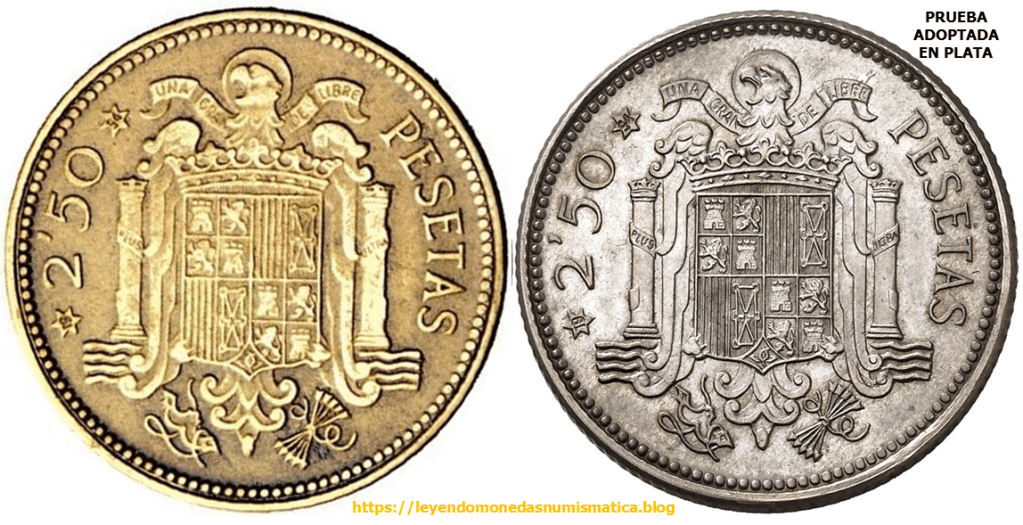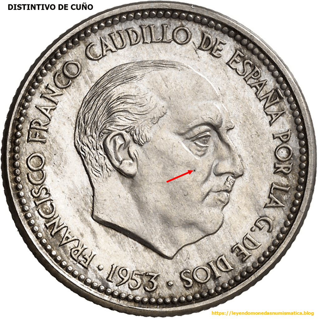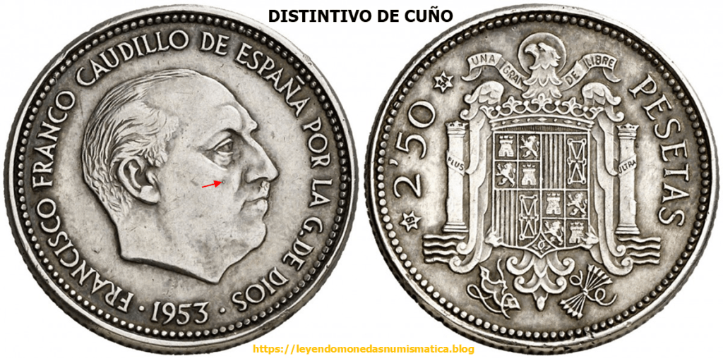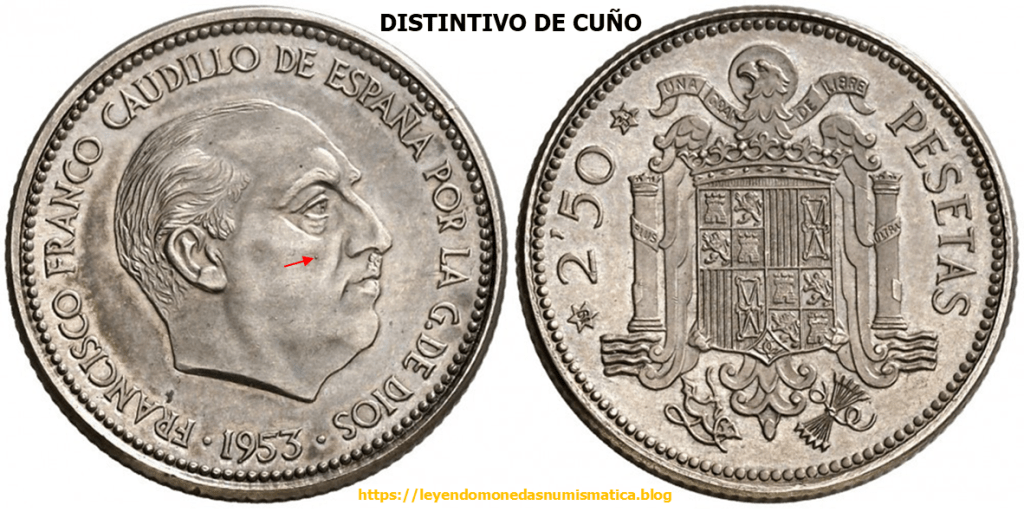 La Prueba adoptada en plata, 2,50 Pesetas 1953*1954, presenta en anverso una señal. Esa marca, esta en el cuño. Porque esta en el cuño?. Porque en la moneda esta en relieve. En principio, las piezas que se acuñen con ese cuño de anverso, tendrán dicha señal. Dicha marca permitirá reconocer el cuño, y por ello la pieza. Los coleccionistas suelen llamarlo Marca de Cuño.