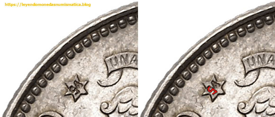 2) La estrella de 1) no tiene dígitos: Los dígitos se hincaban en el Punzón de Trabajo, en la estrella en relieve. Con dos punzones individuales, uno para cada digito. Si los dígitos (54), no son iguales en todas las monedas, significa que estos no pertenecían al diseño de la matriz.