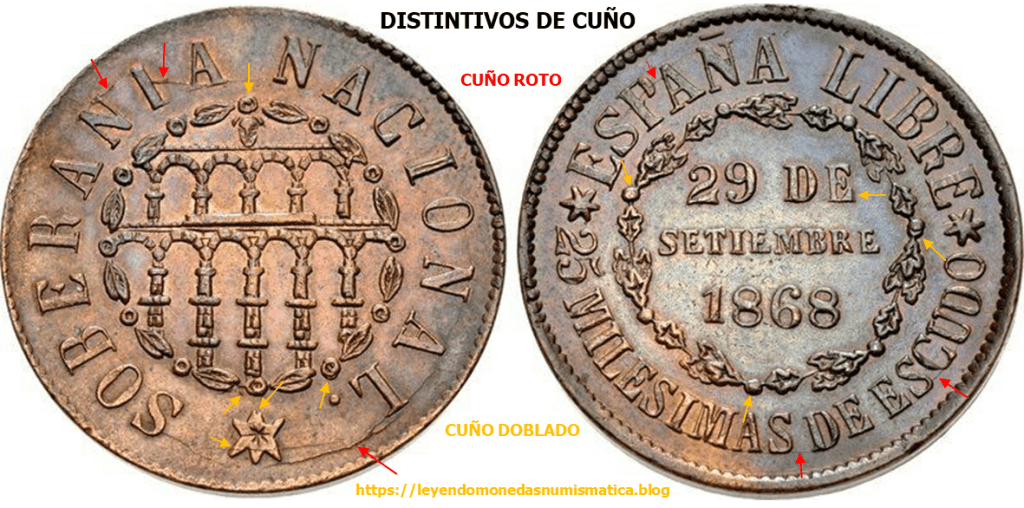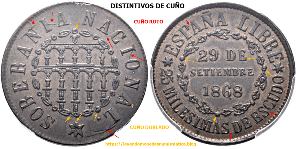 2) Se producen errores/fallas durante la acuñación, que afectan al cuño, como una rotura, marcas incusas por choque de troqueles en vacío, empaste,… Esos errores, también sirven para reconocer un cuño. Pero en este caso, solo afectara, a las piezas acuñadas desde que se produce el error o falla en el cuño.
