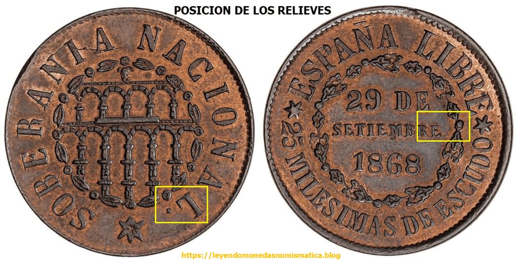 Ademas del arte de la pieza, y de los distintivos de cuño, la posición/orientación de los relieves también ayudan a reconocer el cuño.