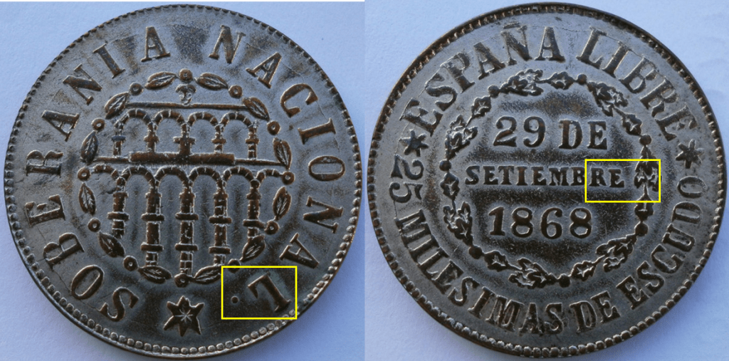 1) Un error que se produce cuando se elabora el cuño (rotura, cuño doblado, rectificación, error de hincado de un bajorrelieve en posición/orientación,…). En este caso, todas las piezas acuñadas, reflejaran en principio, el error.