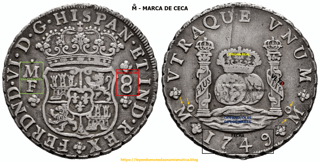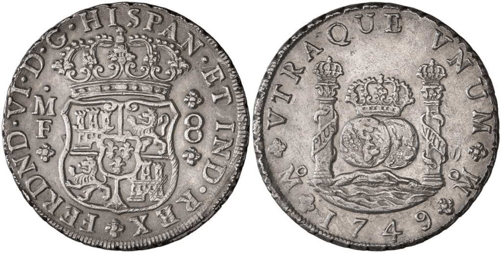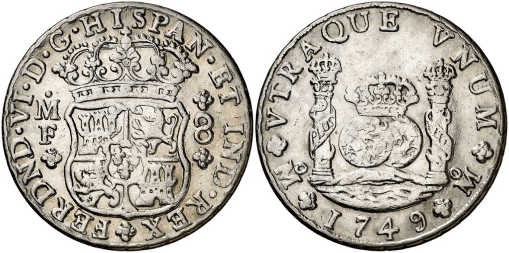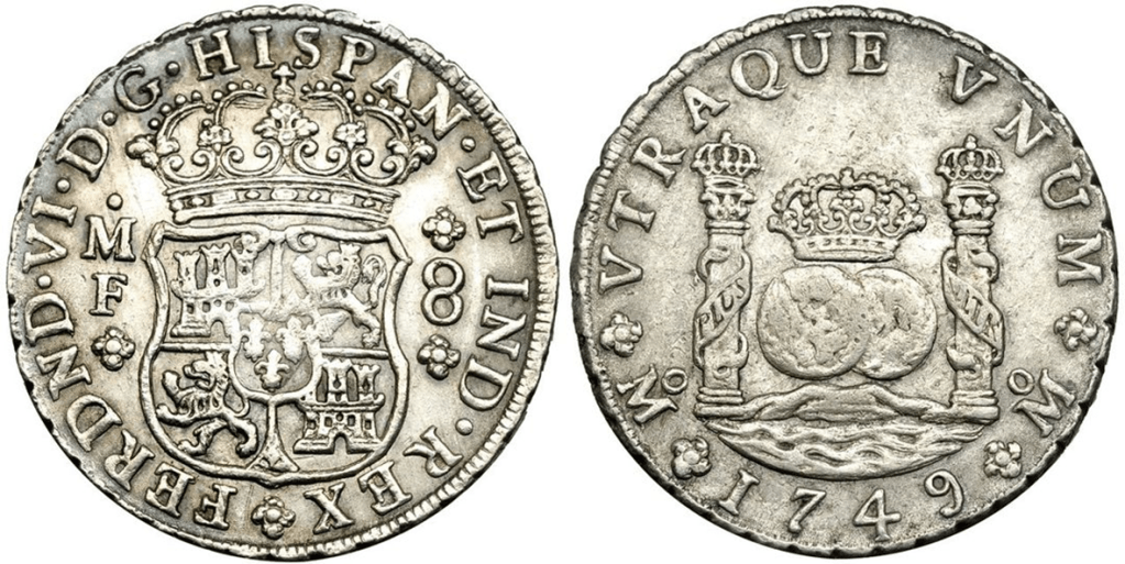 En 1749, en la Ceca de México, se acuñó una bella pieza de plata, bajo el Reinado de Fernando VI. Los Ensayadores fueron Manuel de León y Francisco de la Peña y Flores (MF).
