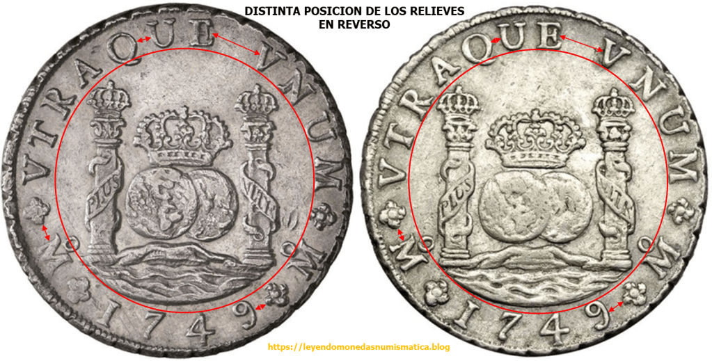 Los relieves tienen diferente posición y orientación. La distancia (flechas rojas), entre ellos varía. Ello delata, que había punzones individuales y por ello cada cuño es diferente. Los cuños se reconocen, por la posición de los relieves. Las coronas sobre las columnas, su posición y orientación, delatan que no forman parte del punzón de columna.
