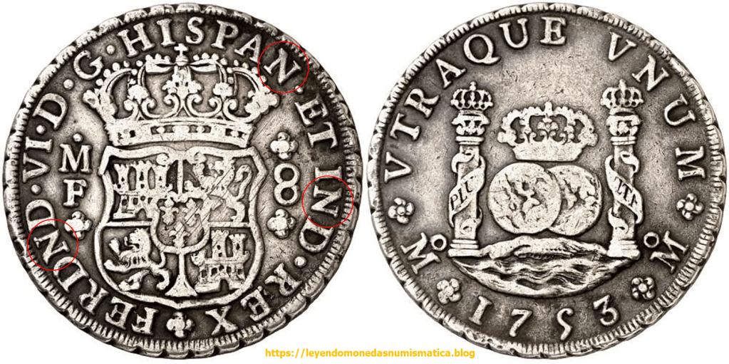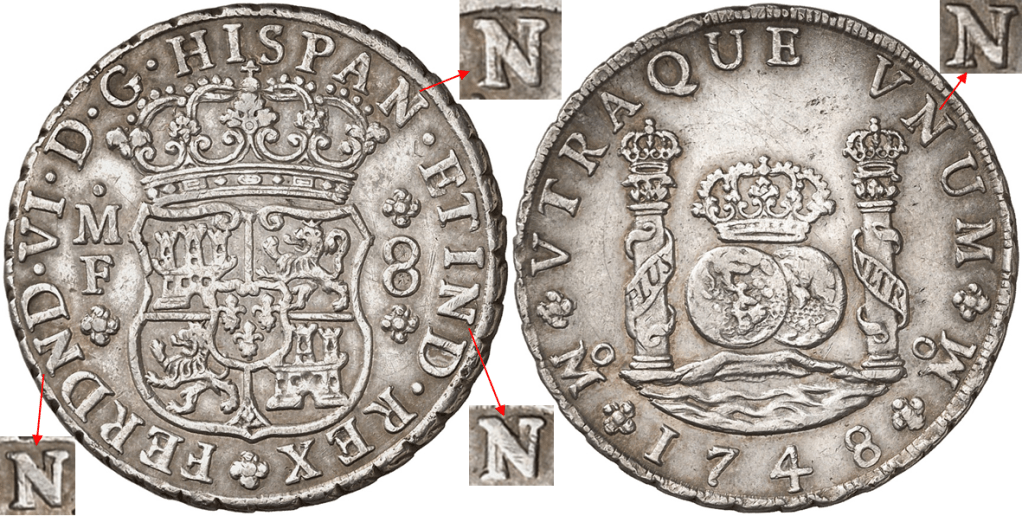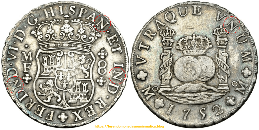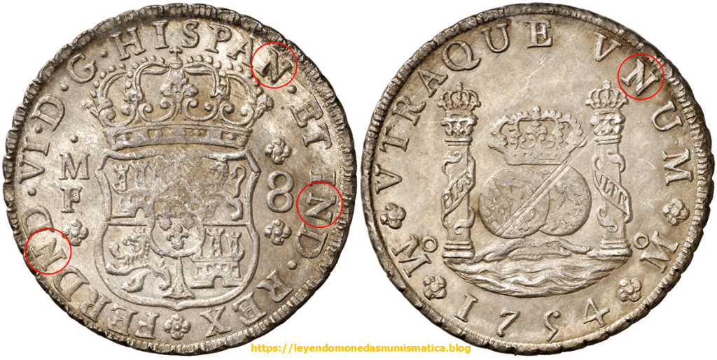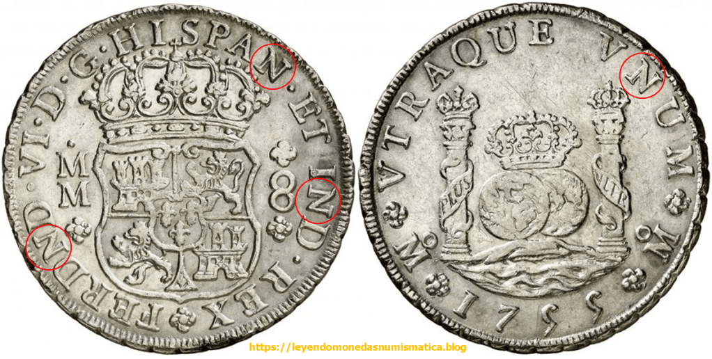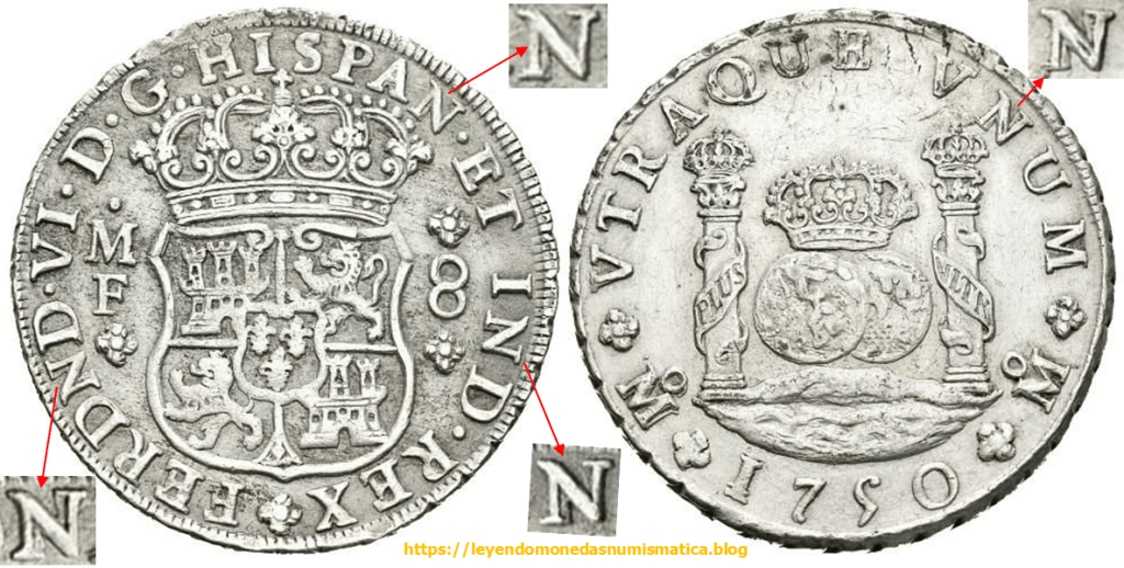 En 1747 salen de la Ceca de México, los Columnarios a nombre de Fernando VI. Estos Columnarios, continúan con la misma sigla N, que vemos en los columnarios de Felipe V. Los Columnarios de Felipe V. Mexico. La N. El nombre del monarca, tiene la sigla N, por ello los columnarios de Fernando VI, tienen cuatro siglas N, en lugar de tres, que tenían los de Felipe V.