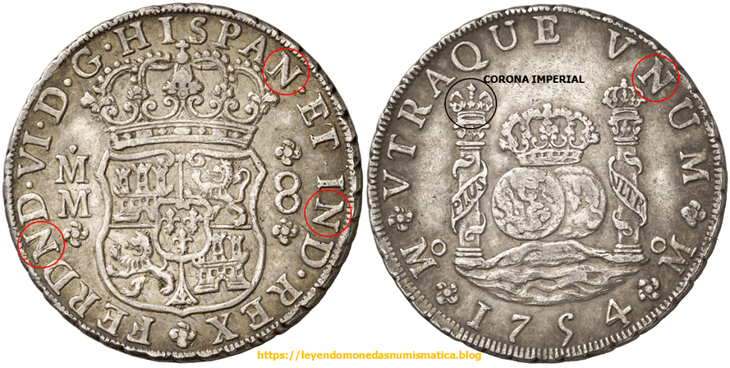 Aunque en ese mismo año, se acuñan igualmente columnarios con las dos coronas reales sobre ambas columnas del reverso. Los ensayadores son Manuel de León y Francisco de la Peña y Flores (MF). https://siemprenosquedarae.wixsite.com/columnario/mexico-fernando-vi
