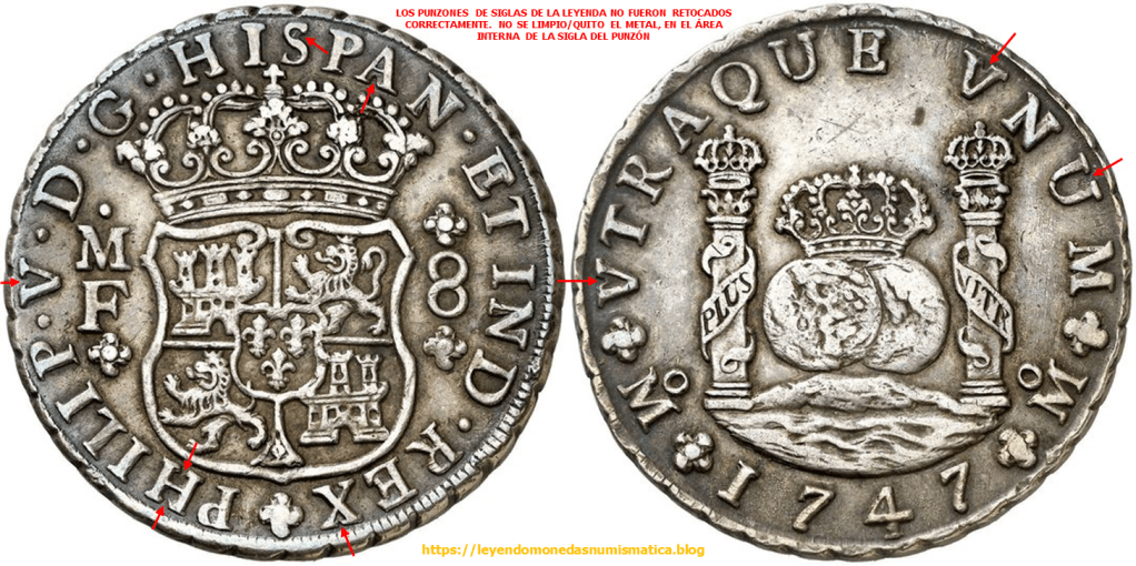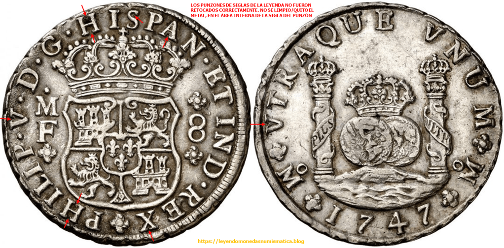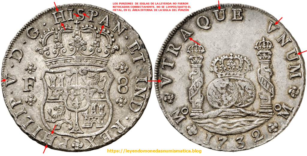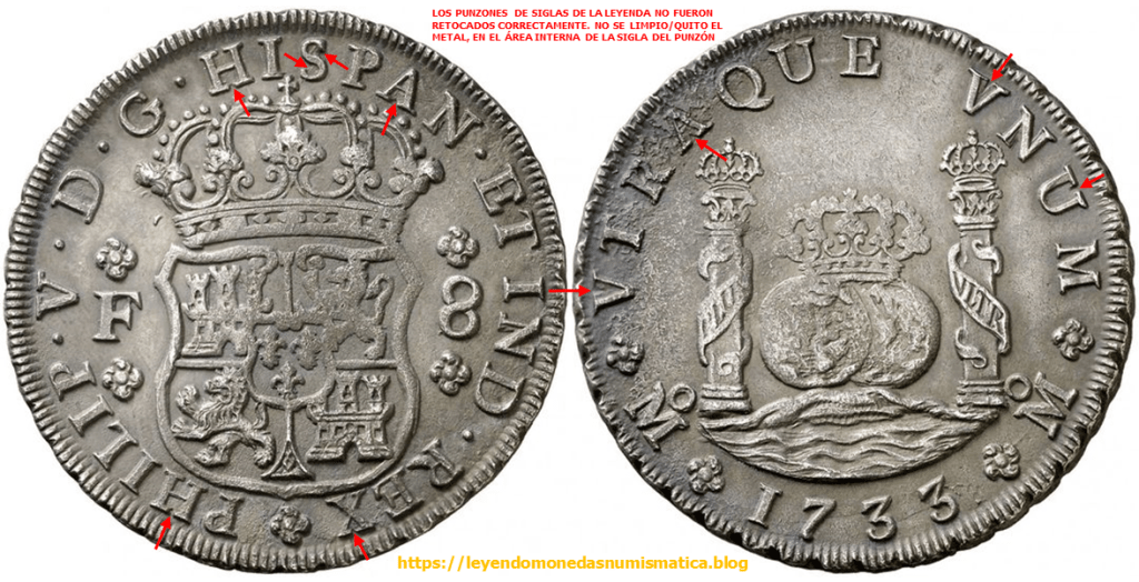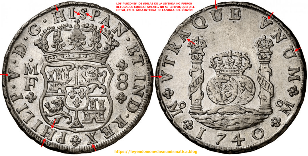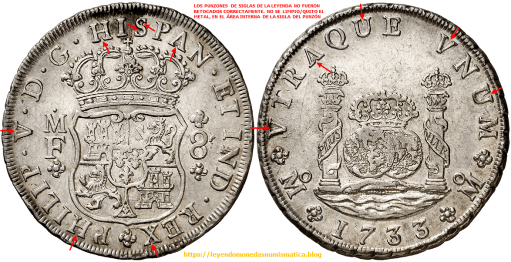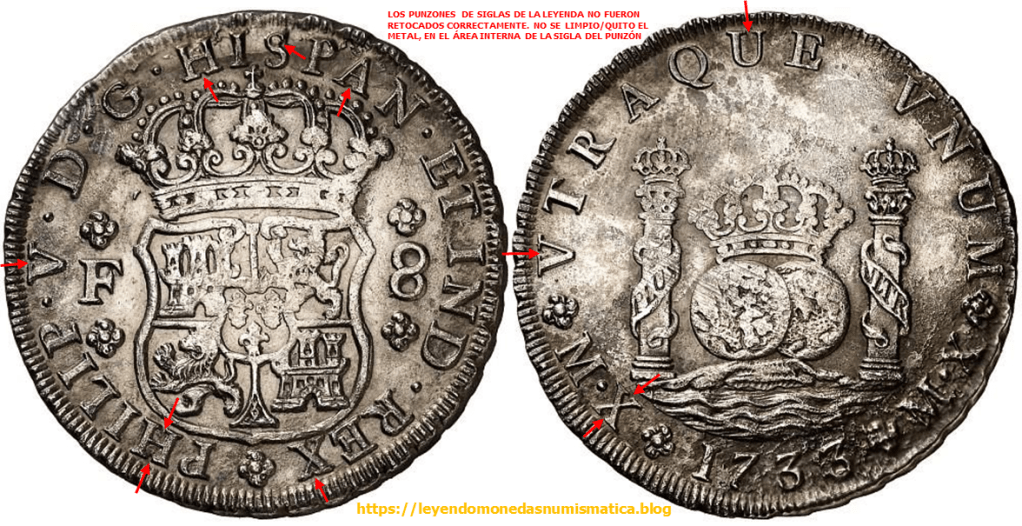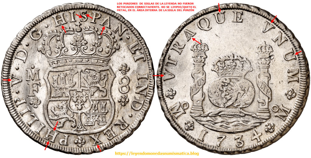 El relieve que señalan las flechas rojas pertenece al cuño. Porque?. Porque esta en relieve en la moneda. Pero no pertenece al diseño de la Sigla. El error está en el cuño, la prueba de ello – 8 Reales 1732. Felipe V. México. Columnario.
