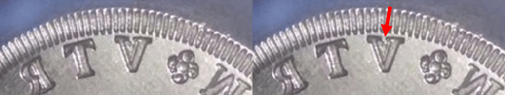 Los Reales de a 8 Columnarios, Felipe V, ceca México, ya nos decían que el error de la siglas nos llevaba al cuño. La imagen del cuño es evidencia de ello. La flecha roja señala la Sigla/Letra V.