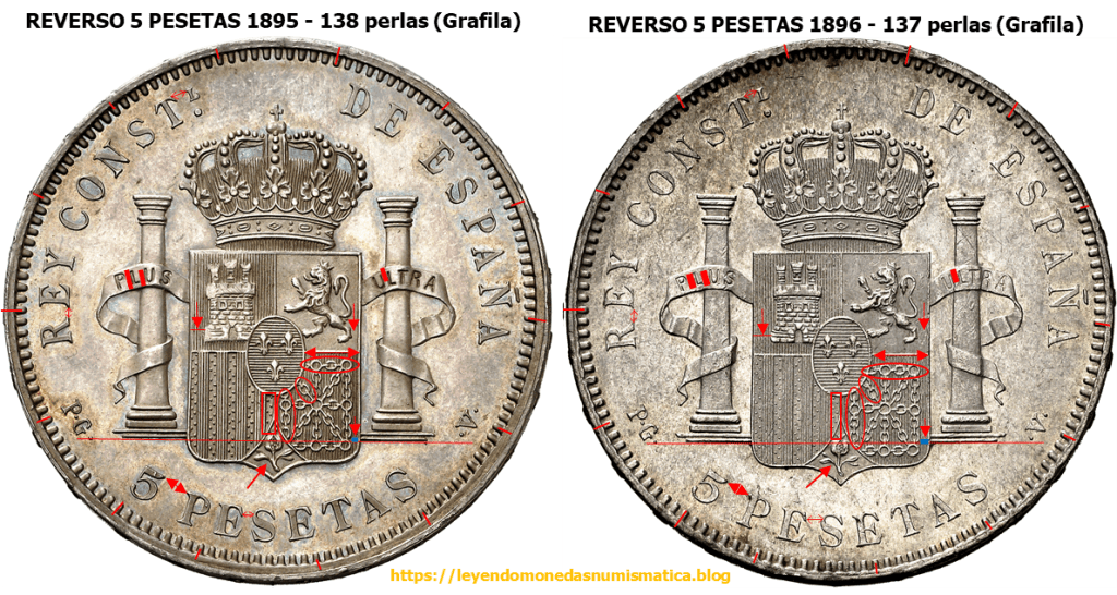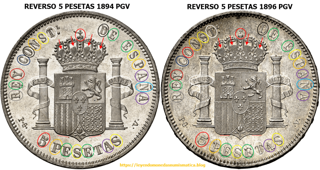 Las siglas/letras de la leyenda son distintas en diseño comparando los reversos. La dife-rencia en el diseño del 5 es muy evidente. La corona también es distinta. Las columnas son diferentes, y sus cartelas también. El escusón tiene 21 líneas en ambos reversos. El reverso de 1894 tiene 138 perlas en la grafila. El de 1896, 137 perlas.