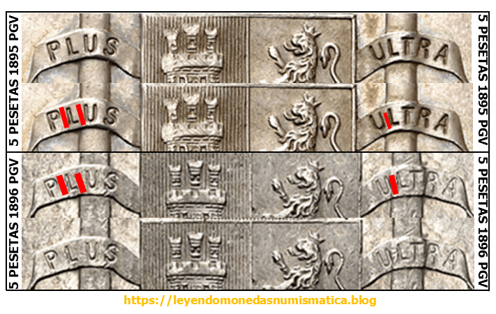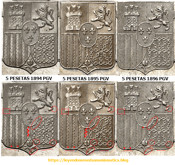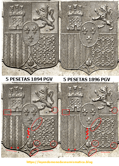 3) Parece que el duro de 1895 PGV se acuño con dos Cuños únicos, uno para anverso y otro para el reverso. El anverso se podría haber utilizado para la emisión de 1896, rectificando el ultimo digito de la fecha principal (1895). El reverso no se podría haber utilizado, aún coincidiendo ensayadores y juez de la balanza, porque el escusón no tiene 21 líneas.