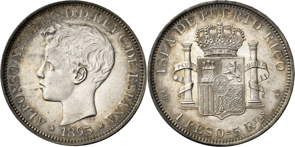 Comparando los Reversos del Peso de Puerto Rico y 5 pesetas 1895 Alfonso XIII PGV