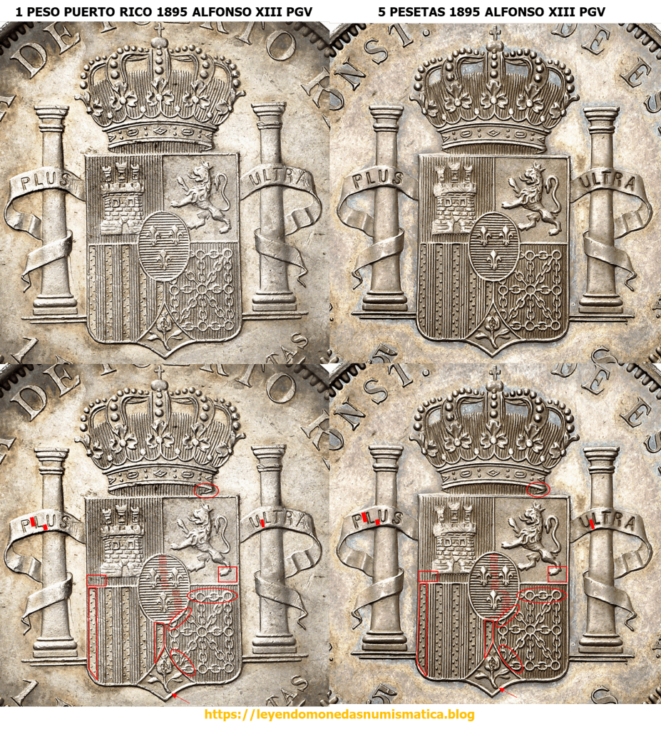 Es obvio que son diferentes reversos. Pero los dos reversos tienen algo en común, el mismo diseño del escudo. Tanto la corona, cuarteles, columnas y escusón tienen el mismo diseño. Eso delata, que el Duro de 1895 PGV se acuño en la FMNT. 1 Peso de Puerto Rico 1895. Alfonso XIII. PGV