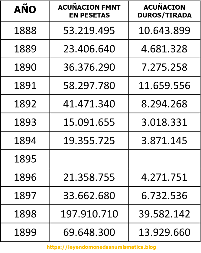 1) Durante el reinado de Alfonso XIII, se acuñaron Duros de Plata desde 1888 hasta 1899, excepto en el año 1895. Duros Para circular en España. Fuente – Ministerio de Hacienda, MEMORIA DE LA DIRECCIÓN GENERAL DEL TESORO PÚBLICO Y ORDENACIÓN GENERAL DE PAGOS DEL ESTADO