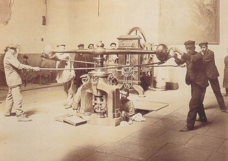 Prensa de volante en acción, Ceca de Madrid, 1899. [Foto: Espasa Calpe]. https://www.segoviamint.org/es/