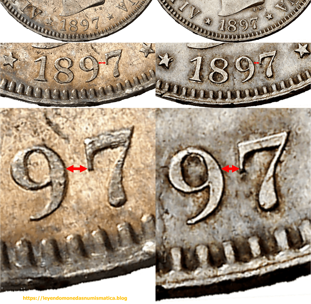 Comparando los dos anversos, se puede apreciar una diferencia. La posición del digito 7 de la fecha principal. Esa diferencia delata, que el digito 7 se hincaba en el cuño de anverso, con un punzón en su punta con dicho digito.