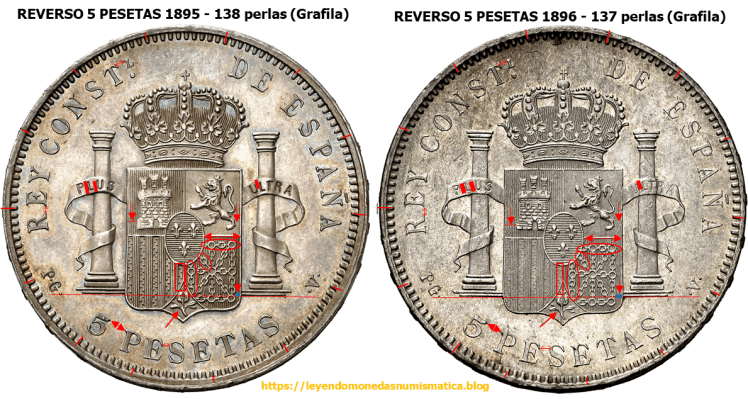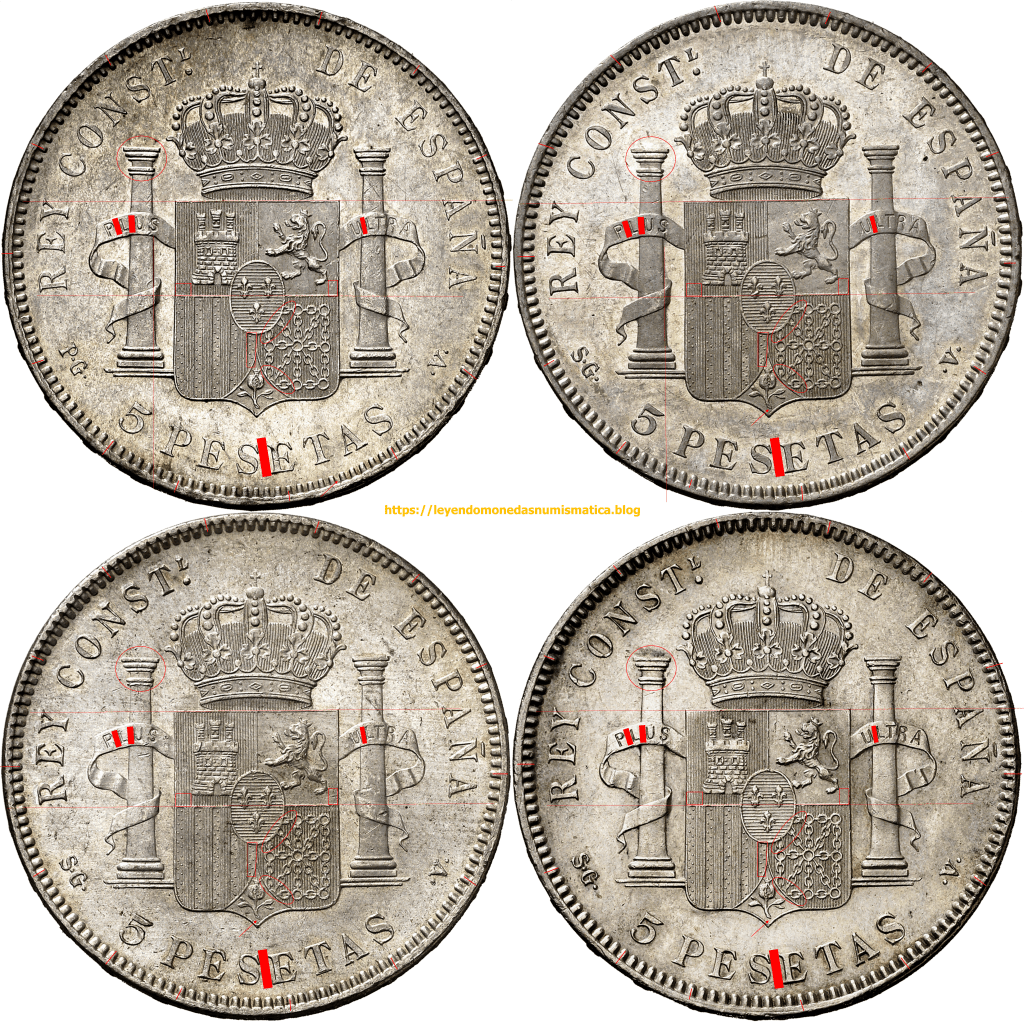Las siglas de la leyenda, tienen el mismo diseño en el reverso de las 5 pesetas 1895 y reverso de 5 Pesetas 1896. El escudo es diferente. Esto lleva a pensar, en principio, en punzones (siglas). Podría haber un Punzón con toda la leyenda del reverso excepto las siglas de ensayadores y juez de balanza. Pero por la posición/orientación, de las siglas de ambos reversos, parece que no lo hay. Y si hay punzones de siglas, el escudo es un Punzón (de maquina). 5 Pesetas 1895*18-95. Alfonso XIII. PGV. Tupé.
