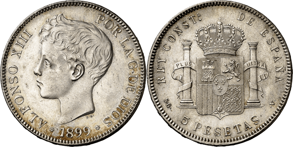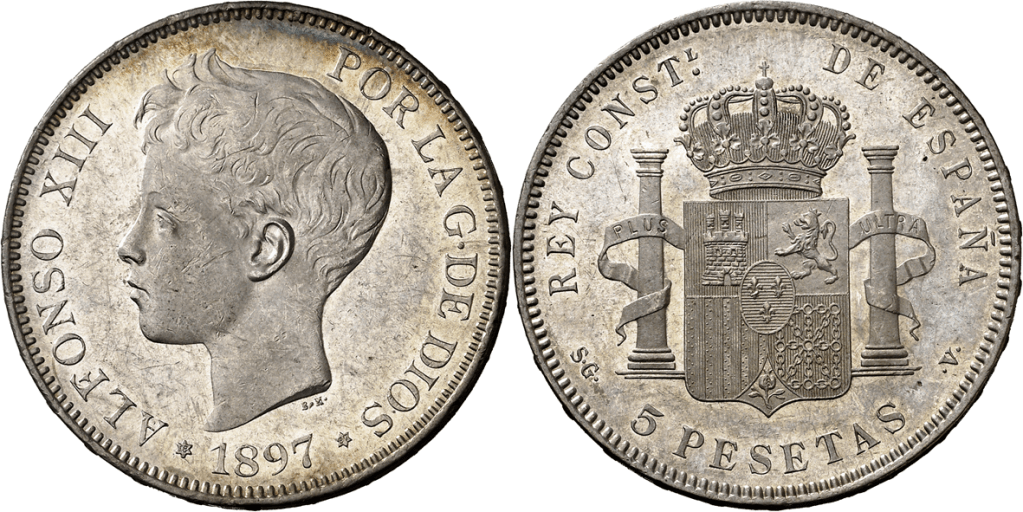 En 1896, se acuñó el Duro de Alfonso XIII con el nuevo Busto. El nuevo Busto, conocido entre los numismáticos como Tupé, representa al Rey con 9 años de edad. No fue el primer Duro de plata acuñado con el nuevo Busto. Existe otro Duro, menos conocido, acuñado en 1895. 5 Pesetas 1895*18-95. Alfonso XIII. PGV. Tupé.