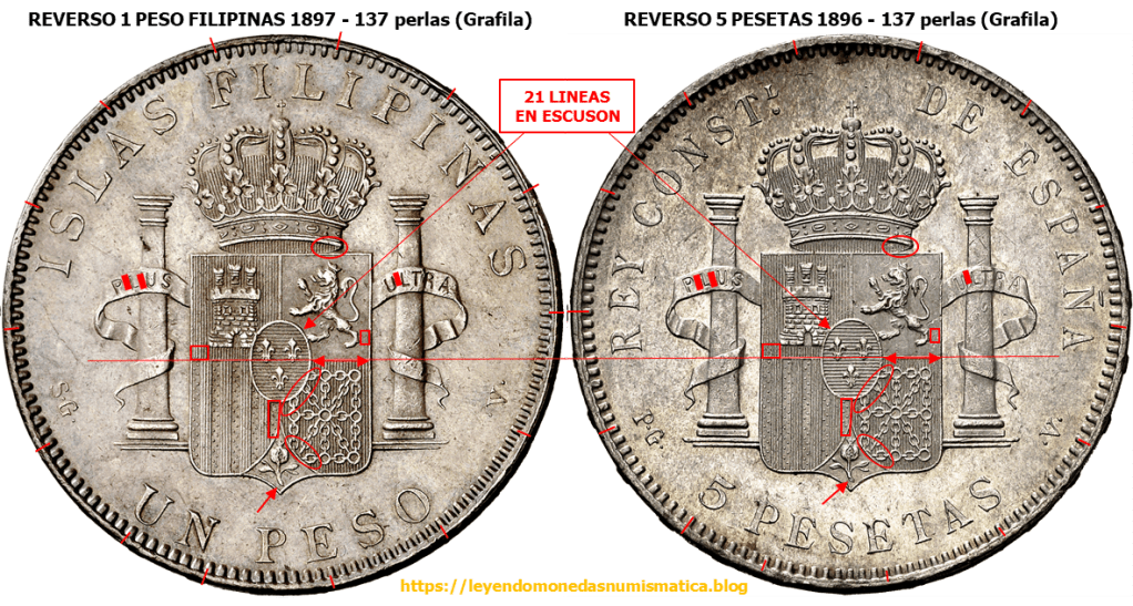 Comparando el Peso 1897 Islas Filipinas, con el reverso de un duro Tupe (1896), se puede observar que ambos escudos son iguales en diseño. Eso en principio, nos lleva a pensar que ambos escudos tienen un mismo origen. Ese origen común, sería un punzón, el Punzón de Maquina. ¿Cómo dos monedas de distintas tiradas, tienen el mismo diseño del escudo en su reverso?. La explicación mas factible, es que hay un Punzón, que se utilizó en las dos Matrices de Reverso de ambas tiradas. Ese Punzón, es el Punzón de Maquina con el diseño en altorrelieve del escudo.