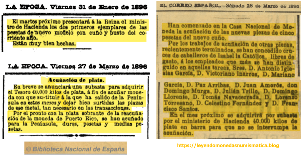 El grabador de la FMNT (Madrid) fue Bartolomé Maura (B.M). Se acuñaron Duros Tupé con fecha 1896, 1897, 1898 y 1899. En Plata Ley 900 milésimas, con un peso de 25 gramos y modulo 37.5 mm. En el reverso del duro de 1896 los ensayadores y Juez de balanza son Félix Miguel Peiró Rodrigo – Antonio García González – Remigio Vega Vega (PG V). En el resto de los duros son Arturo Sandoval – Antonio García González – Domingo Remigio Vega Vega (SG V). En 1899 se acuña el ultimo duro de plata para circular en el Reino de España.