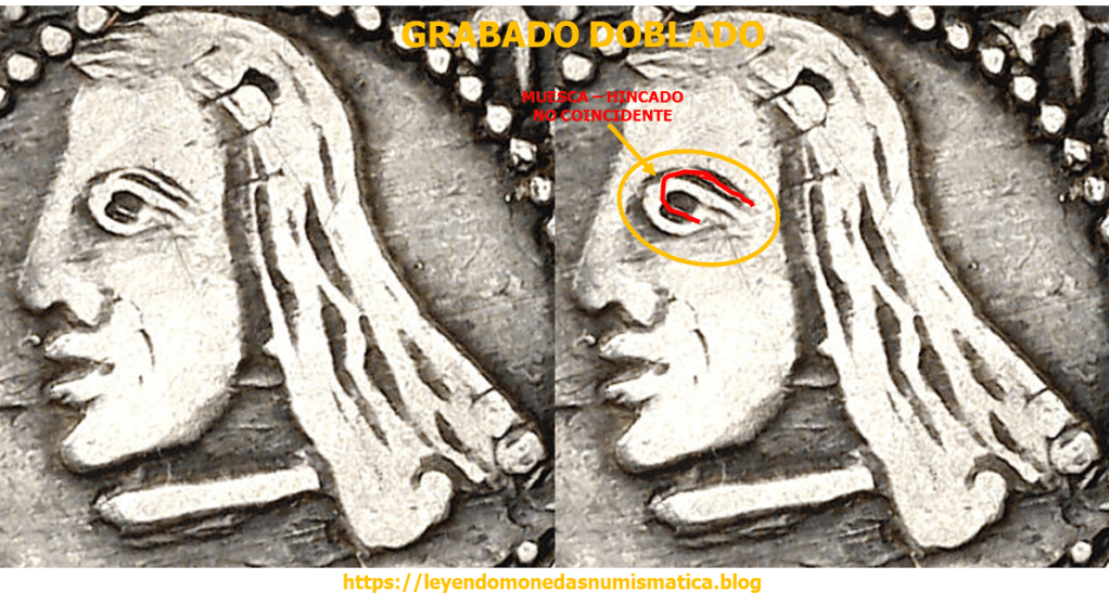 Improntas dobles o con doble perfil. Error en el Grabado del Cuño Rodillo. El ojo del busto, esta doblado en el grabado del Cuño Rodillo. Hay un hincado no coincidente, mientras se realizaba la operación. La imagen muestra la no coincidencia entre los dos ojos en relieve.