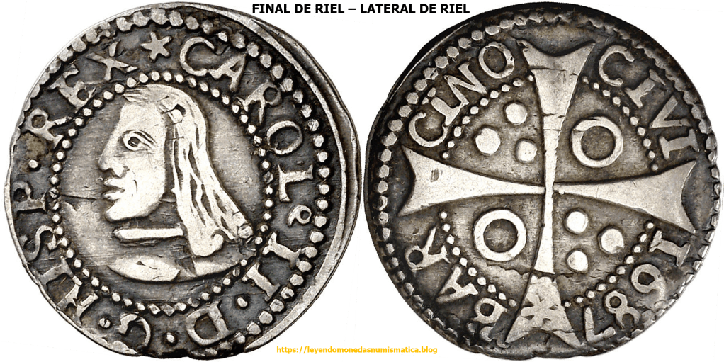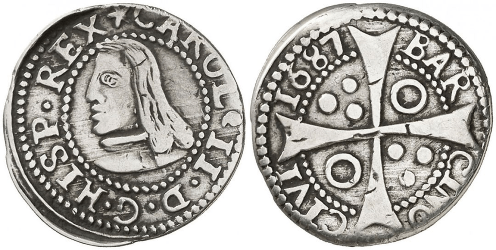 El Croat 1687 Carlos II, acuñado a Molino en Barcelona, y analizado a continuación, presenta unos detalles interesantes, fruto de la técnica de acuñación por la cual se elaboró. 1 Croat 1687 Carlos II. Barcelona. FINAL DE RIEL y DESCENTRADO. ACUÑACION A MOLINO.