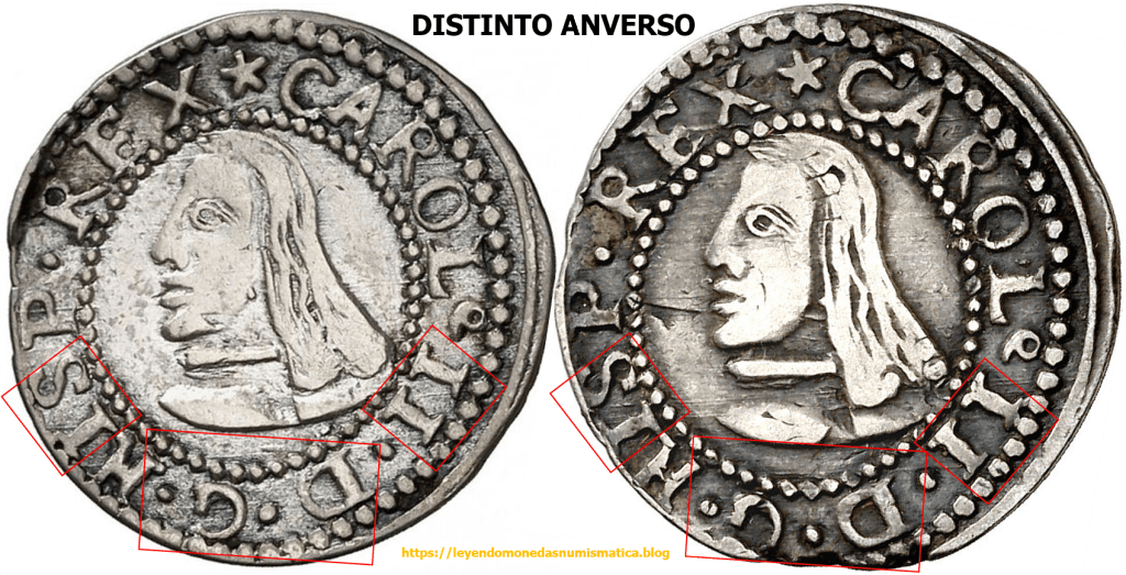 Comparando los dos anversos, se puede leer, que la posición de algunos relieves en ambas piezas es distinto. Fijarse en las trazos rojos, para ver esa diferente orientación de los relieves.