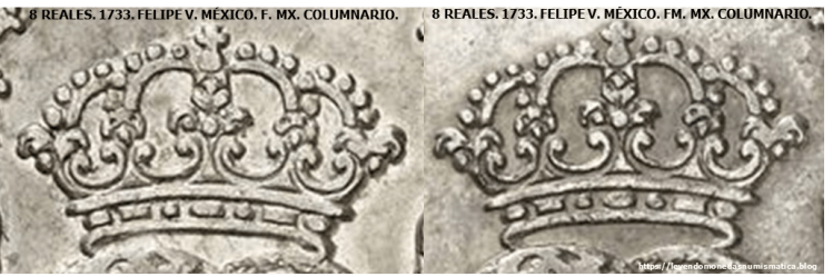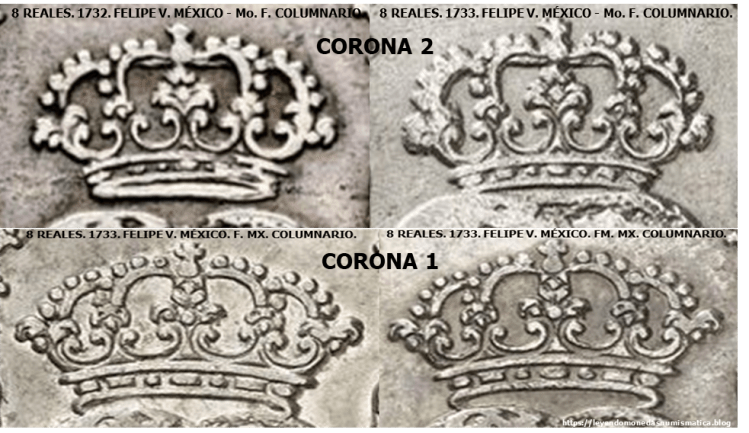 En la Ceca de México, en los inicios de la acuñación de los reales de a 8 Columnarios, nos encontramos, con dos punzones de la Corona, diferentes. 8 Reales Felipe V. 1733. México. Columnario. LAS DOS CORONAS DISTINTAS DE REVERSO.