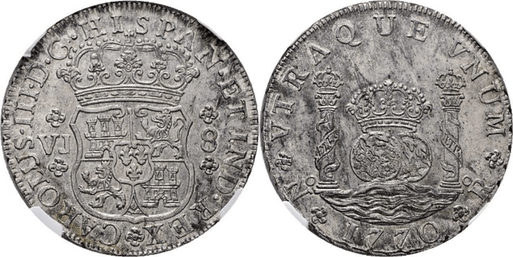 MONEDAS DE LOS BORBONES. Nuevo Reino. 8 reales. 1770. JV. Cy no la cita. SC, brillo original. NGC MS62 (capsula ligeramente quebrada, slab a little bit broken). Tono oscuro. Doce ejemplares conocidos. Magnífico columnario de la rara ceca de Nuevo Reino.
