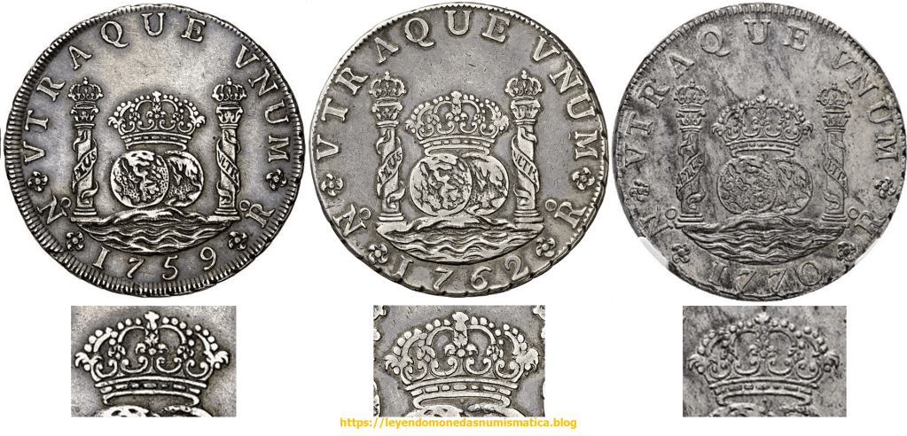 La Corona 1, su diseño, es similar a la Corona, que vemos en los ejemplares subastados, de los Reales de a 8 Columnarios de la Ceca de Santa Fe.