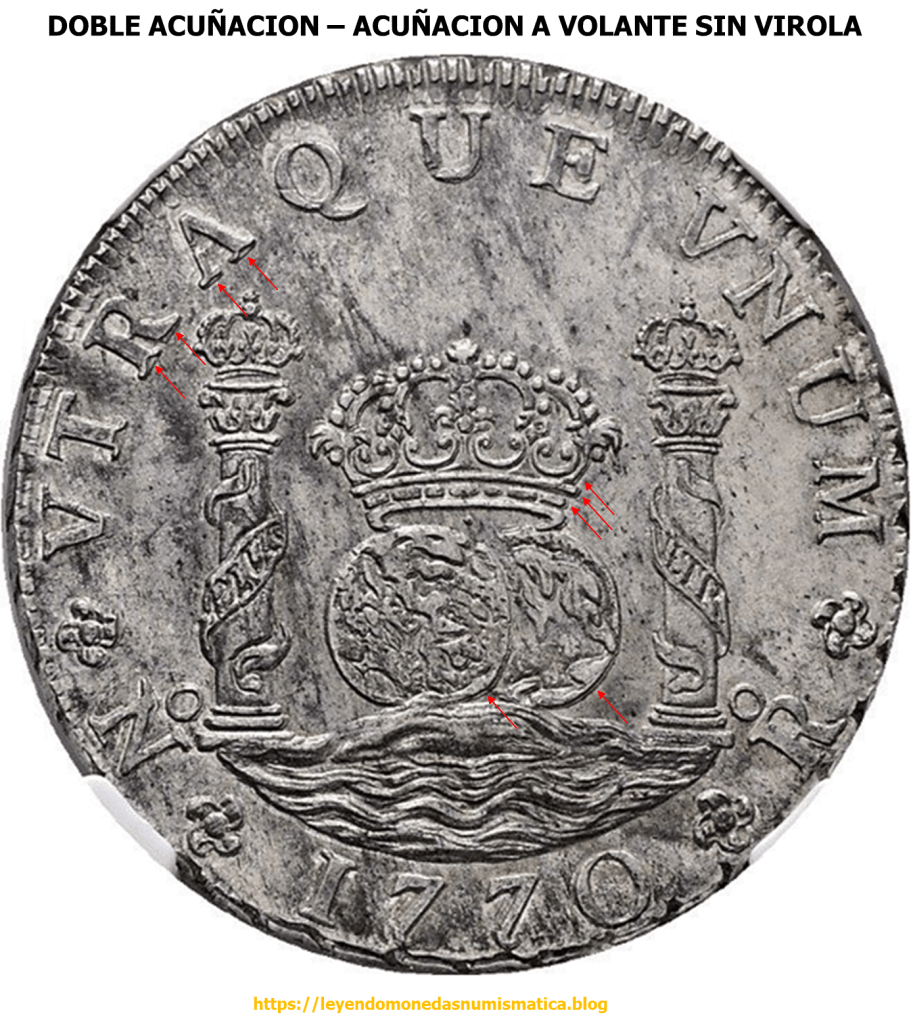 El Real de a 8 Columnario de Santa Fe, 1770, presenta Doble Acuñación en el reverso. DOBLE ACUÑACION casi COINCIDENTE. ACUÑACION A VOLANTE SIN VIROLA. La orientación de los dobles contornos, la gráfila y el flujo del metal en la moneda.