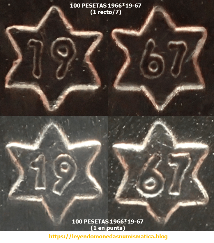 En el año 67, se acuñan 100 Pesetas 1966*19-67 (plata). Pero hay dos tipos de Anverso para la estrella 67. 100 Pesetas 1966. Estado Español. DOS ANVERSOS. El anverso 1 (Primer busto) lo encontramos en las emisiones de 1966 *66 y * 67 (1 en punta). Es el acuñado con la ley de 18 marzo de 1966. El anverso 2 se acuña con la ley del 22 julio de 1967. Es a partir de la emisión de 1966*19-67 (1 recto/7), cuando encontramos el nuevo tipo de anverso. El anverso 2 (Segundo busto) lo encontramos para *67 (1 recto/7), *68, *69 (Palo Recto y Curvo) y *70.