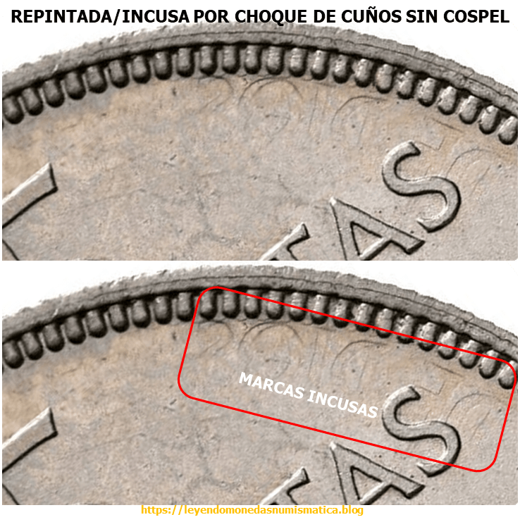 A veces, los cuños chocan entre si, sin cospel en la cámara de acuñación, transfiriéndose improntas entre ellos. Da lugar a cuños contramarcados, y las marcas de los cuños, se transferirán durante la acuñación del cospel. Esas marcas serán incusas. Es lo que se conoce como repinte o Marcas Incusas por choque de troqueles sin cospel. Repintada/INCUSA por choque de Cuños sin cospel.