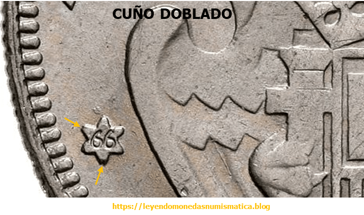 La grafila del Cuño reverso se transfirió en los dos choques al troquel de anverso. Al no coincidir ambos choques en posición, la grafila se ve doblada.