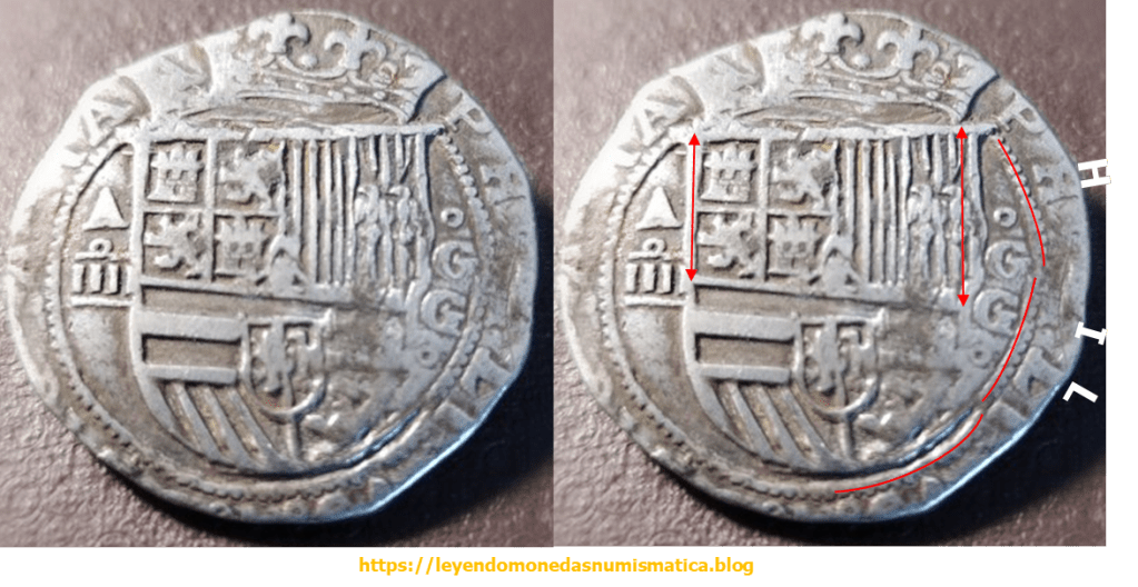 - La distancia entre la H y L de PHILIPPUS: se aprecia la primera I del nombre del monarca, pero mientras su distancia a la L es adecuada/correcta, su distancia a la H es excesiva.