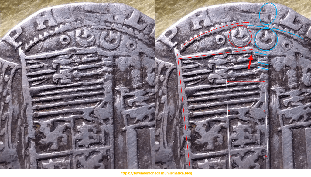 En rojo y azul, se marcan/señalan los relieves, fruto de la divergencia en el golpe de acuñación. La flecha roja señala un punto de rotura en el relieve. EL RELIEVE ROTO/abierto en la Acuñación a Martillo. La Grafila/Orla no cerrada. Pero no solo es un punto donde el relieve no es continuo, sino es un punto de cambio de orientación. Las líneas oblicuas señalan la disposición/orientación de las barras. Y estas van alineadas con sus respectivas G. Lo cual es otro punto fuerte, para determinar que la Doble G, es consecuencia del golpe de acuñación no coincidente, es decir, Doble Acuñación.