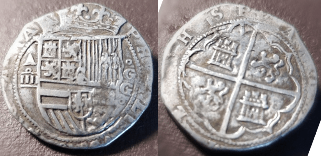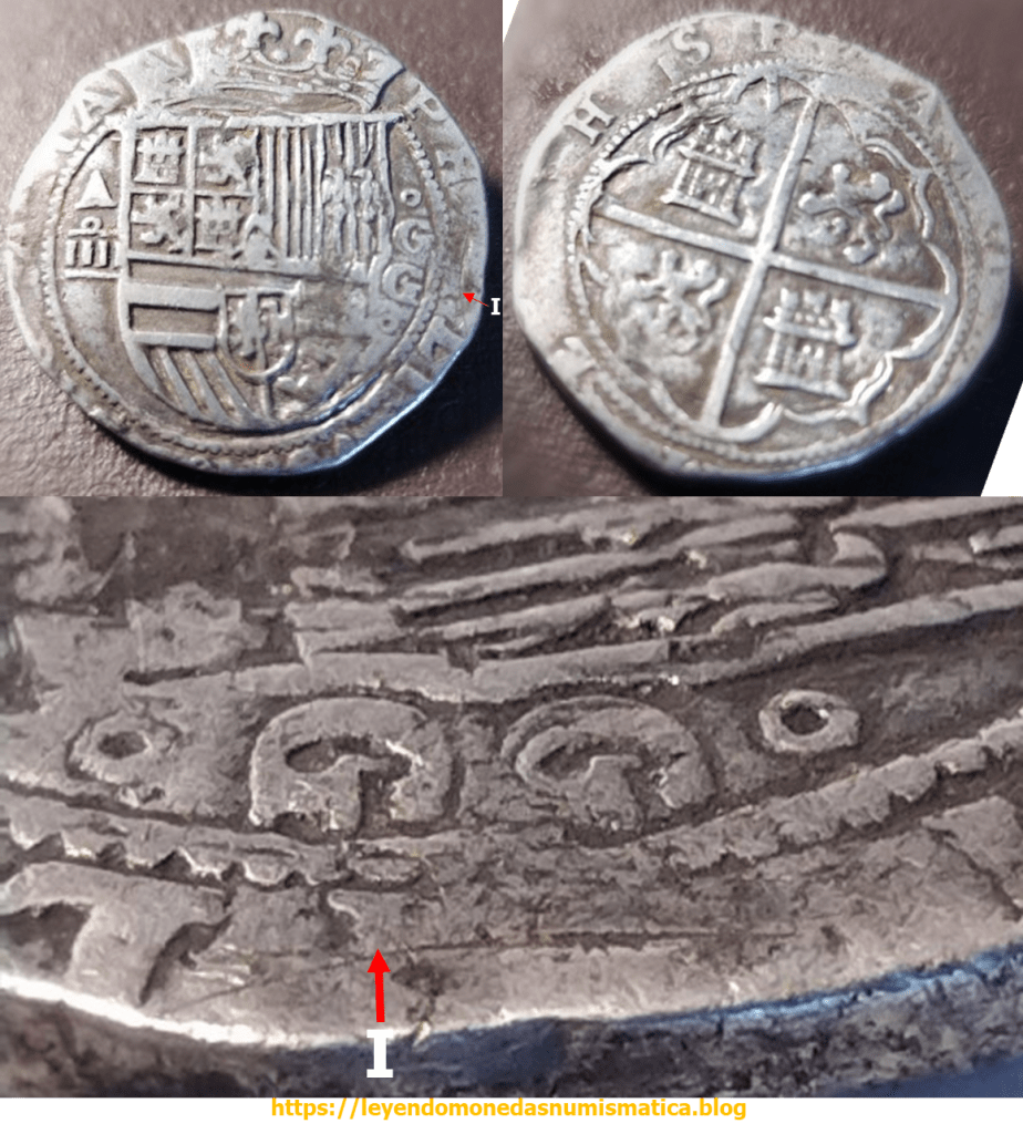 La pieza presenta Doble Acuñación en ambas caras. Un punto que destaca en el anverso es la Doble G. La Doble Acuñación ha dado lugar a que en anverso se haya acuñado una doble G. La sigla de la Ceca esta Doblada. 8 Reales 1661. Felipe IV. Potosí. ACUÑACION A MARTILLO. EL DOBLE RELIEVE.
