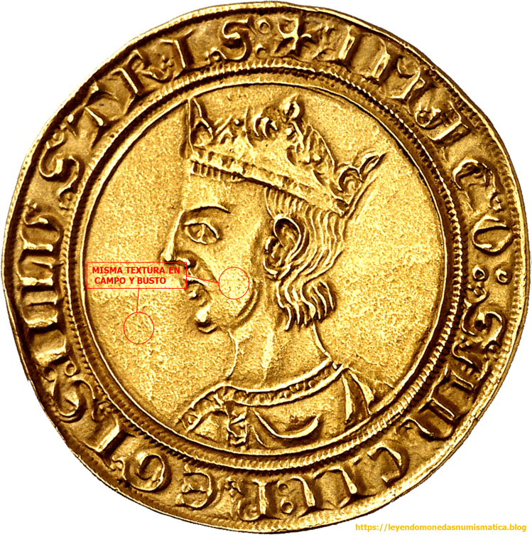 Dobla de oro. Sancho IV. Murcia. Textura del metal y Doble Acuñacion.