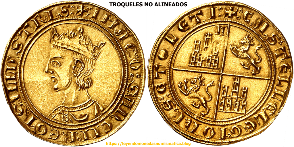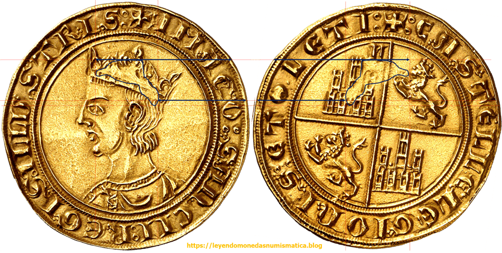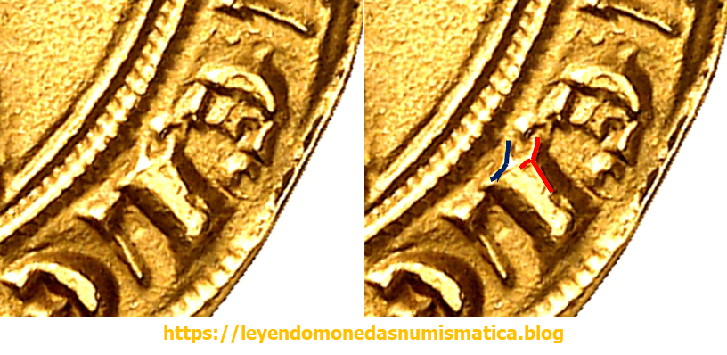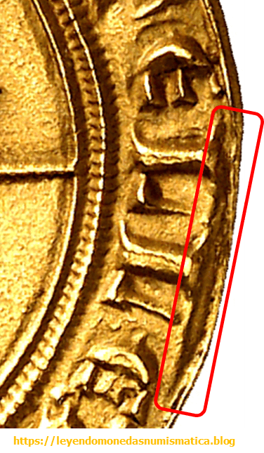 A la hora de elaborar el cuño, a través del hincado de punzones y el uso del buril, se pueden producir errores. En el reverso de esta pieza se leen dos errores evidentes. Uno el señalado por la flecha azul (castillo), y el otro en la leyenda CASTELLE LEGIONIS. La leyenda del reverso es CASTELLE : LEGIONIS, pero al parecer hubo un error durante la elaboración del cuño.