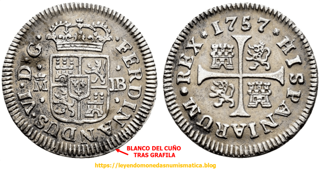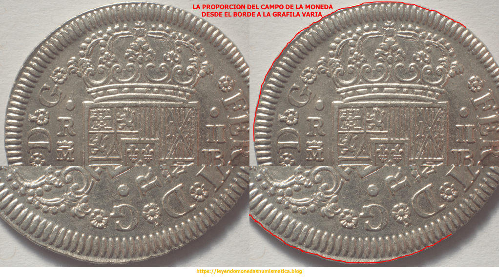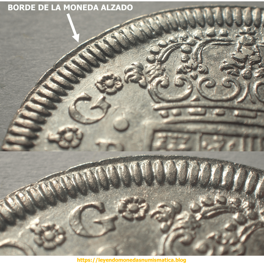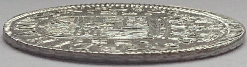 2) El borde del cuño. El borde del cuño es en principio liso y circular. El cuño suele ser mas grande que el cospel, y después de la grafila externa es liso/plano. En principio, los cuños de las piezas acuñadas a Volante (sin virola), son mayores que el cospel. En la pieza de 2 reales, por ejemplo, así se puede leer.