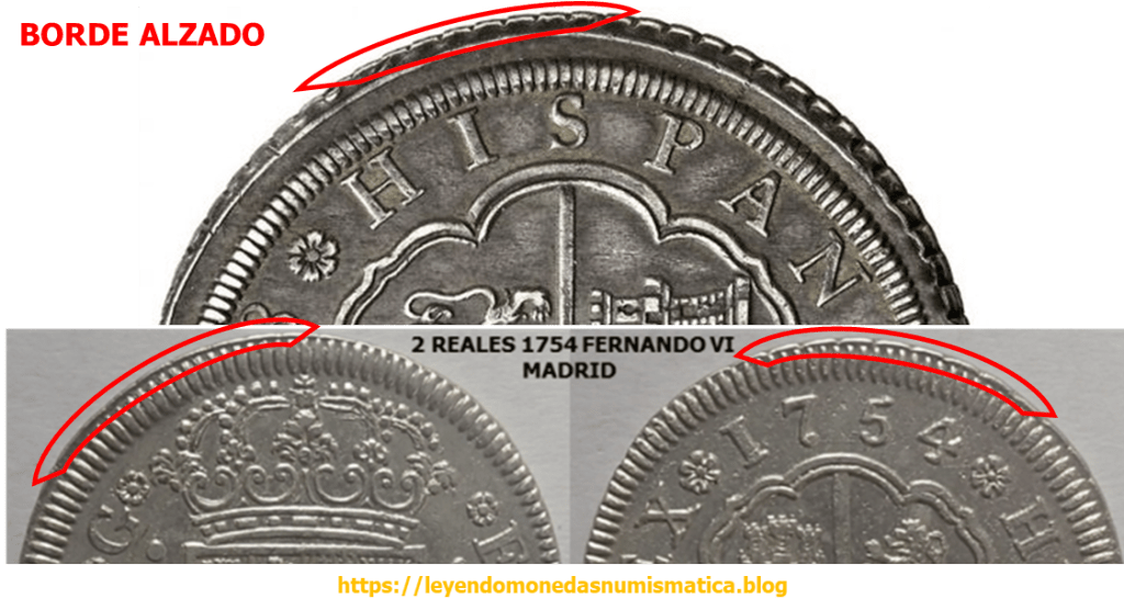 El borde del cuño no es. ¿Por que?. Porque el campo de la moneda tras la grafila, seria en principio, uniforme en tamaño. El borde esta levantado entre los dentículos de la grafila e igualmente tras ellos (trazo rojo). Si fuera causa del cuño, la grafila estaría entera, no tocaría el borde levantado la grafila y tras ella estaría el campo de la moneda.