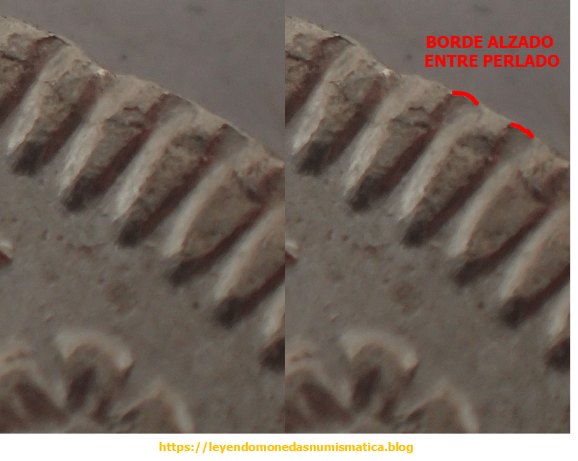 b) Si el cerrillado del canto, se realiza una vez acuñado el reverso y anverso, el hueco entre perlas tendera a alzarse (dependiendo de la presión de los cerillos).