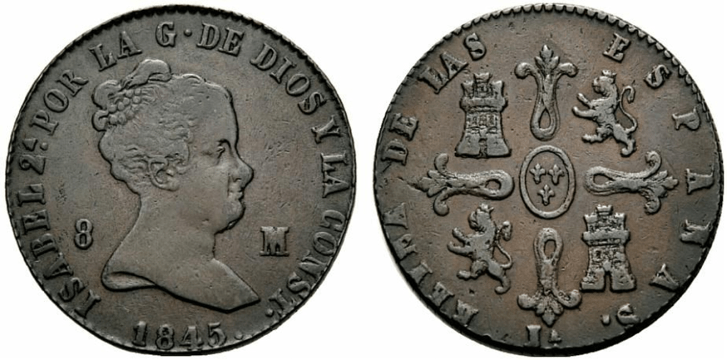 Las siguientes piezas de 8 Maravedíes, acuñadas en la Ceca de Jubia, fueron acuñadas a volante, donde el cospel recibía las improntas de los cuños de reverso y anverso. La cerrilla troquelaba su canto estriado.