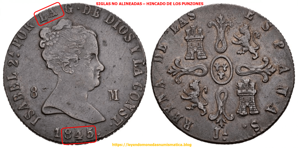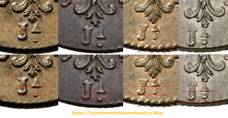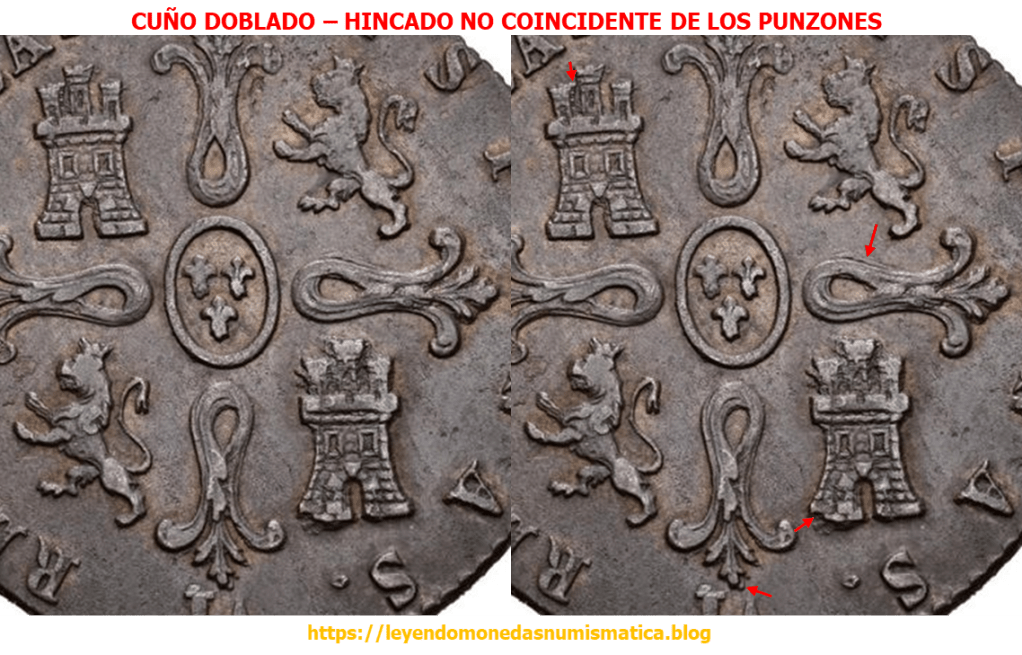 Diferenciar cuños es muy sencillo, solo hay que comparar posición de los relieves. Los cuños eran elaborado a través del hincado manual de un juego punzones individuales, y el hincado con la prensa a volante del busto. Por ello, a veces podemos encontrar, relieves doblados (Cuño Doblado por hincado no coincidente del punzón), posición no alineada de las siglas o letras de la leyenda,…