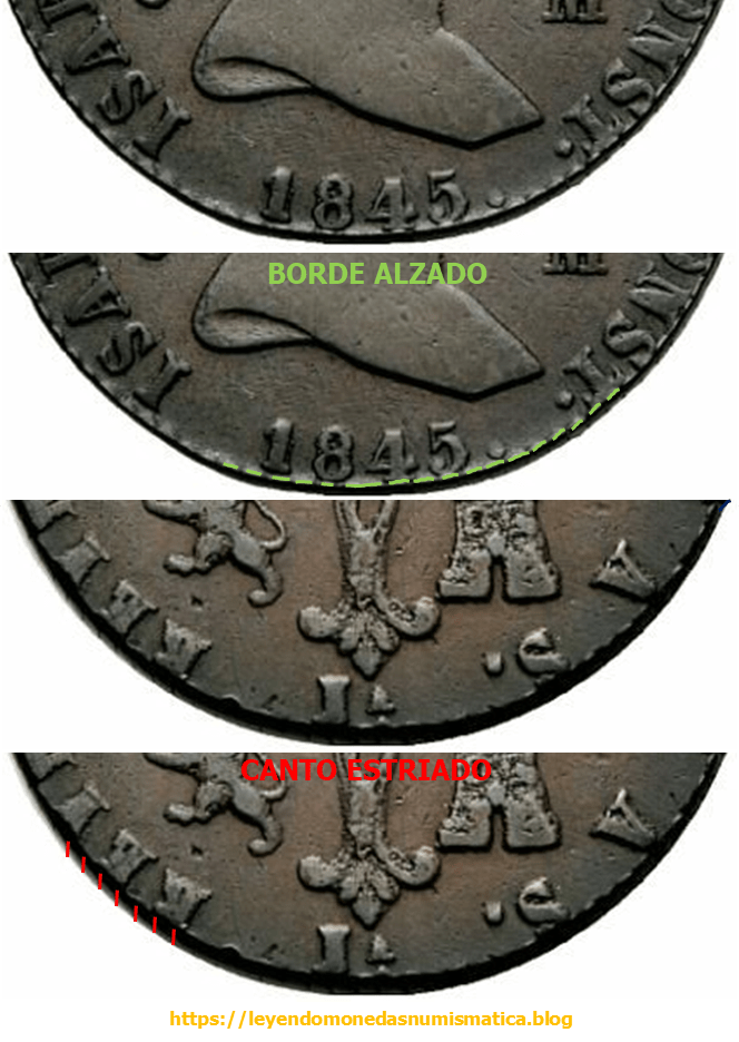 El borde de la pieza, en su área cortada en su diseño, esta alzado. Dicho alzado no es el perlado de la grafila, pues como es obvio, en el cuño el perlado de la grafila no esta junto a las siglas. El cerrillado del canto, alza el borde del canto.