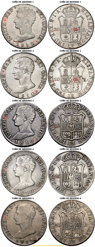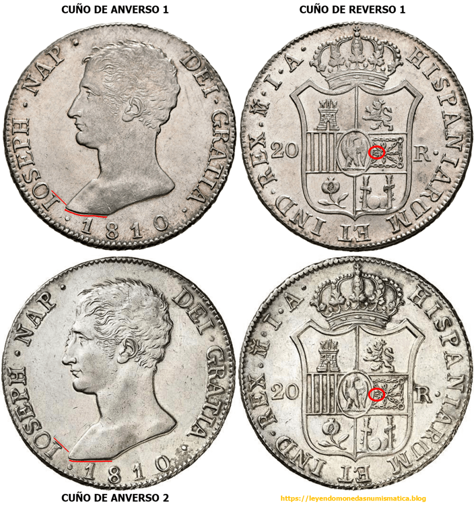 El cuño de reverso 1 se reconoce fácilmente fijándose en el DOBLE ESLABON de las cadenas de Navarra. Se ha doblado dicho eslabón en el cuño (Cuño Doblado). El cuño de anverso 1 y 2 se distinguen fijándose en la base del busto (trazo rojo) y la posición de la sigla I de José respecto al busto.