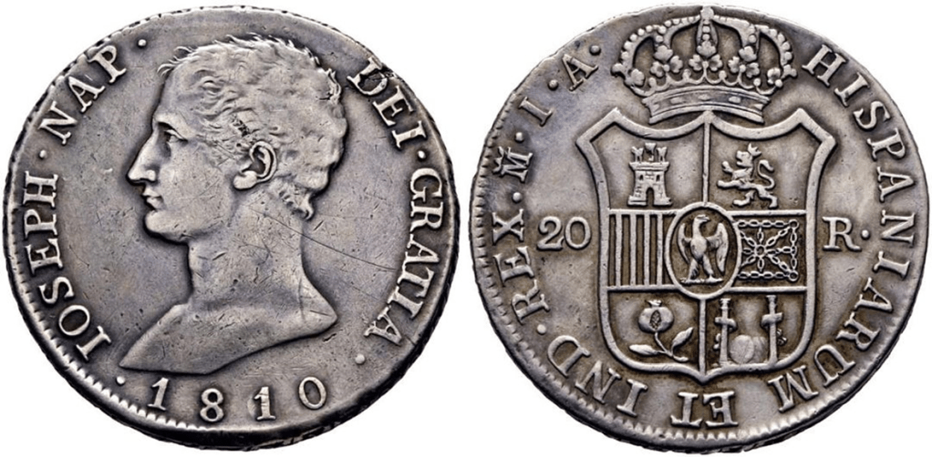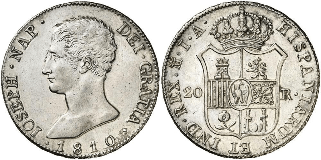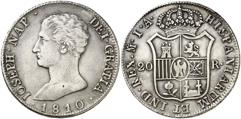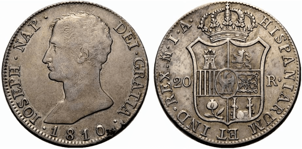 En mayo de 1808 los Franceses entran en Madrid. La Ceca de Madrid de la calle Segovia, se convierte en prioridad. Los franceses quieren acuñar moneda con el busto y leyenda del nuevo gobierno, José Napoleón. El 18 de abril de 1809, se da a conocer la ley que deter-mina el nuevo sistema monetario. Uno de los nuevos valores para la plata, es la moneda de 20 Reales de Vellón. El modulo y la ley (aleación), es el mismo que el Real de a 8 (sistema tradicional español).
