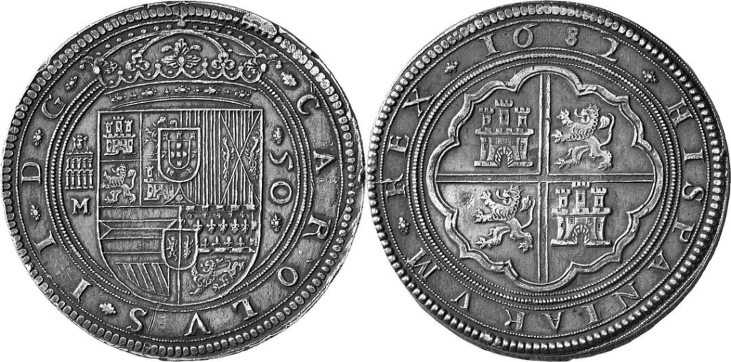 Un trabajo de Glenn Murray, aun no publicado, dice: ”La pieza presente fue fruto del metal que trajeron al Ingenio los mercaderes sevillanos Juán de Gandola y Juán de Illanes pues amplían la petición de poder labrar onzas y centenes y así en 20 de mayo de 1682 piden que se autorice la acuñación de reales de a 50. El 3 de junio el superintendente confirmó: ”…..recibí la orden para hacer los reales de ha cincuenta y doblones de todos los géneros, quedanse disponiendo los tornillos para ejecutarse….” Cabe destacar también el texto de la nómina laboral que tuvo lugar a partir del 11 de octubre del mismo año ”…. que se hizo de monedas de ordenes de Su Majestad en monedas de reales de a cincuenta reales…” Fijémonos que la labor se realizó en otoño, mes en que los monarcas solían mandar acuñar monedas especiales para fines concretos, en torno a las fiestas navideñas.