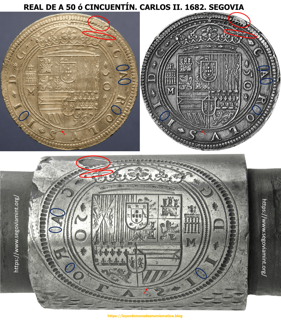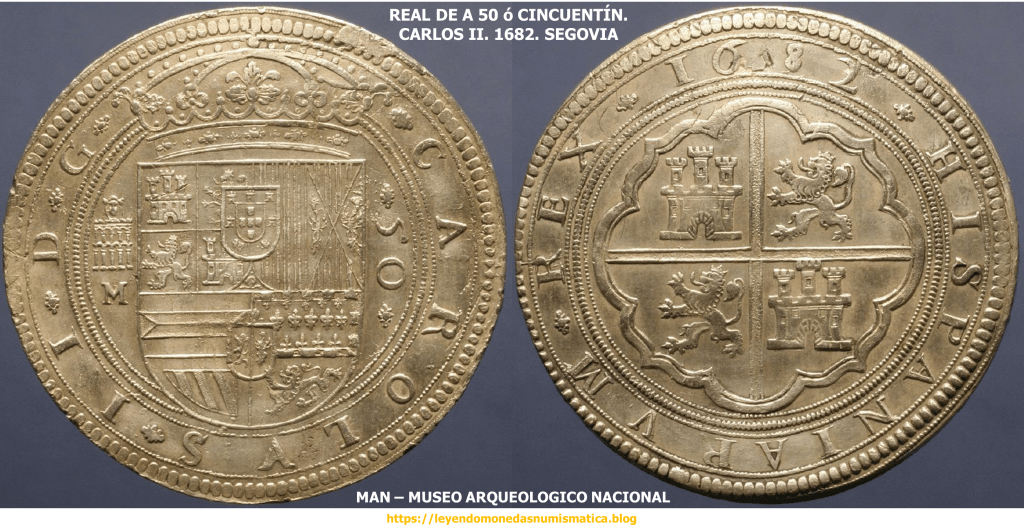En los dos únicos ejemplares auténticos que se conocen, puede observarse que en el cuño del anverso, las letras que componen el nombre del rey CAROLUS II están rectificadas sobre PHILIPPUS IIII; la sigla del ensayador M, sobre R; y en el reverso, la fecha 1682 sobre 1635. Estamos en presencia del único cincuentín que acuñó Carlos II y por lo tanto ante una de las piezas más raras de la Numismática española y mundial. El otro ejemplar conocido se encuentra en la colección del Arqueológico de Madrid y publicado en ”Las 100 mejores piezas del monetario del Museo Arqueológico Nacional” en la pág. 116 nº 44. Estudiadas detenidamente ambas piezas, se llega a la conclusión que fueron acuñadas con los mismos rodillos y bajo la supervisión del ensayador Manuel Manso, como así hace constar su inicial (M) que aparece en el anverso a la izquierda del escudo. Estas grandes monedas iban a dejarse de acuñar con los Borbones, pues éstos no incluían la labor de cincuentines ni centenes.