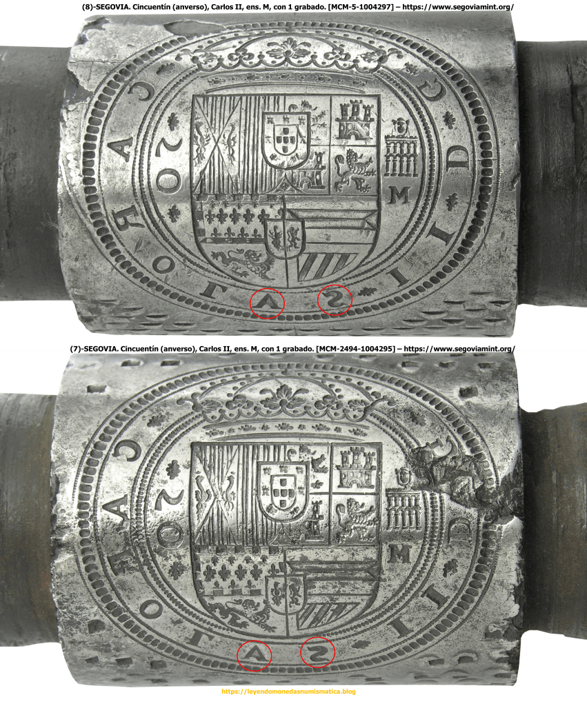 En la web – https://www.segoviamint.org/ encontramos dos Cuños Rodillo de anverso. Ambos comparten el mismo error en los punzones de las siglas S y V. Posiblemente, se usaran los mismos punzones para fabricar/elaborar ambos cuños rodillo.