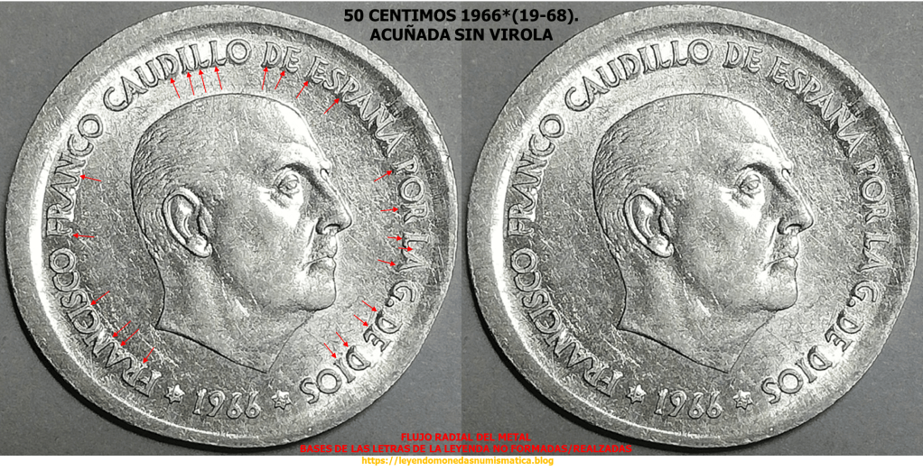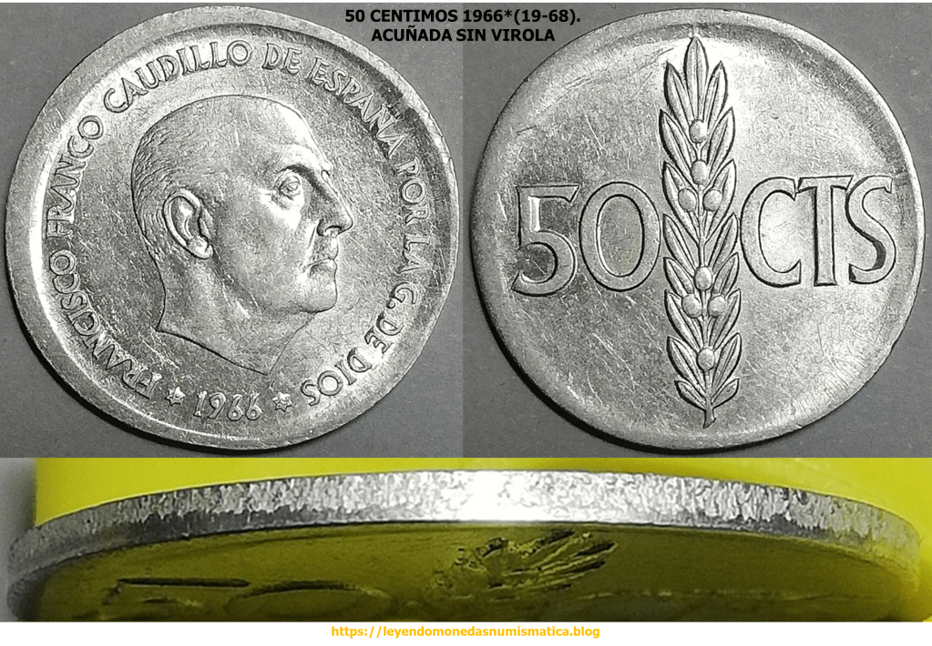 Los 50 Céntimos 1966, pertenecen a una acuñación con virola. La virola dejaba el canto estriado tras la acuñación del cospel. Circularon a partir de 1967. El BOE solo menciona en el Reverso el valor de la pieza, y no habla de estrellas en Anverso.